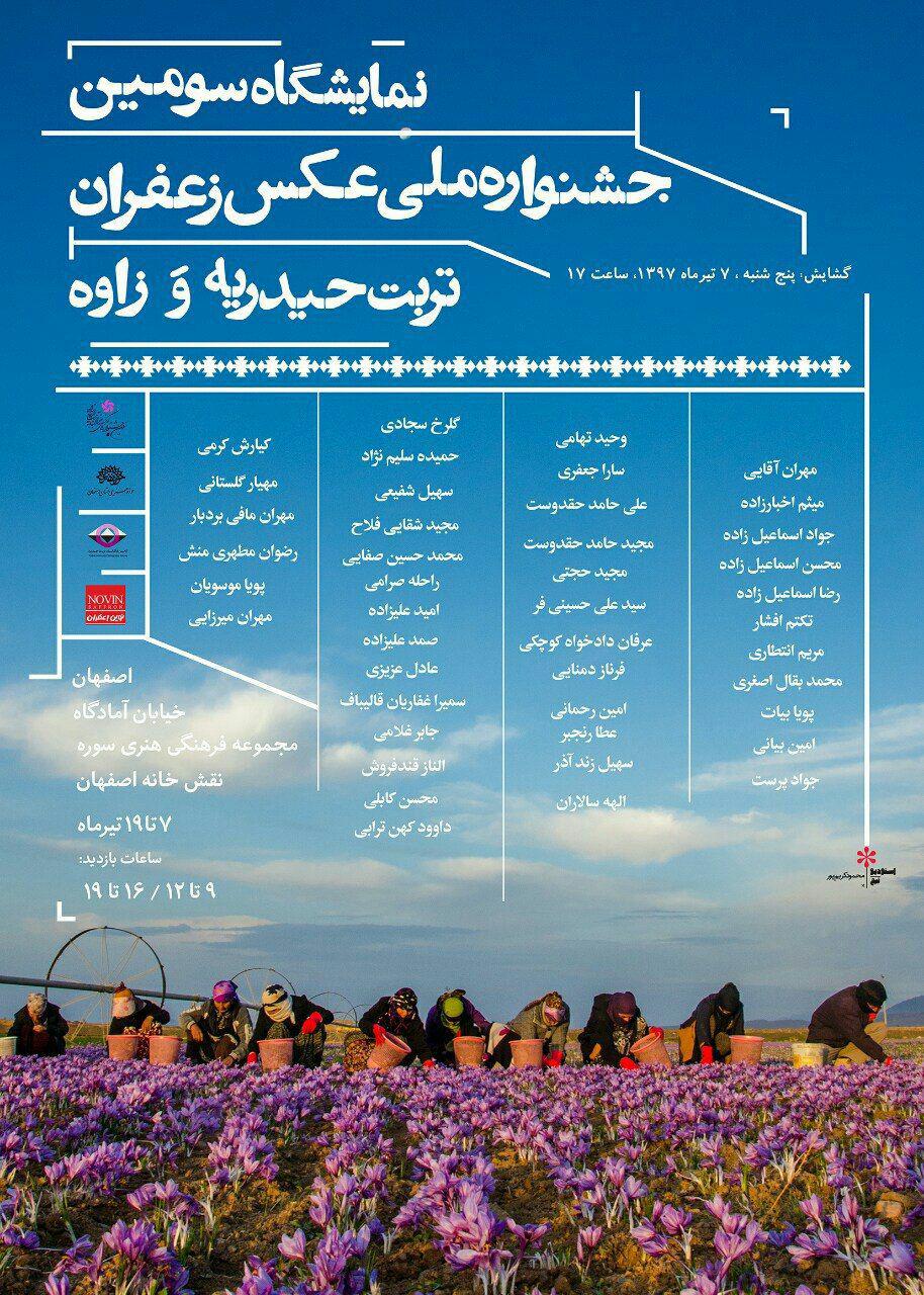 حوزه هنری استان اصفهان با همکاری دبیرخانه سومین جشنواره ملی عکس "زعفران تربت حیدریه وزاوه" نمایشگاه عکس زعفران را در گالری نقش خانه اصفهان برگزار می کند.