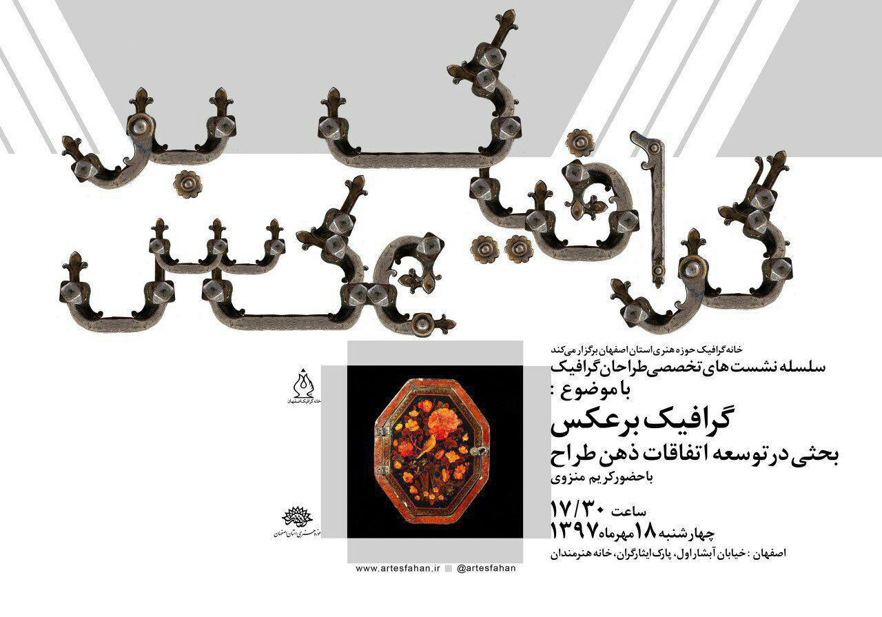 خانه گرافیک حوزه هنری استان اصفهان نشست تخصصی گرافیک خود را با حضور کریم منزوی و باموضوع گرافیک برعکس (بحثی درتوسعه اتفاقات ذهن طراح) برگزارمی کند.