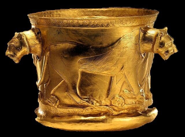 ظرف طلا هزاره یکم قبل از میلاد/ یافت شده در کلاردشت/ بر ران شیران نشان چلیپا دیده می شود/ صفحه 160